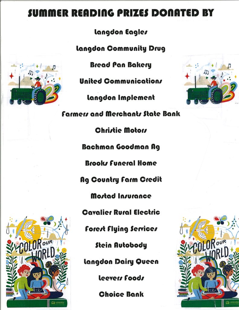 The Cavalier County Library would like to thank the community for their generous support of our summer reading program. This year we had 207 kids going into grades 1-12 participate! Donations from the following businesses made this possible!